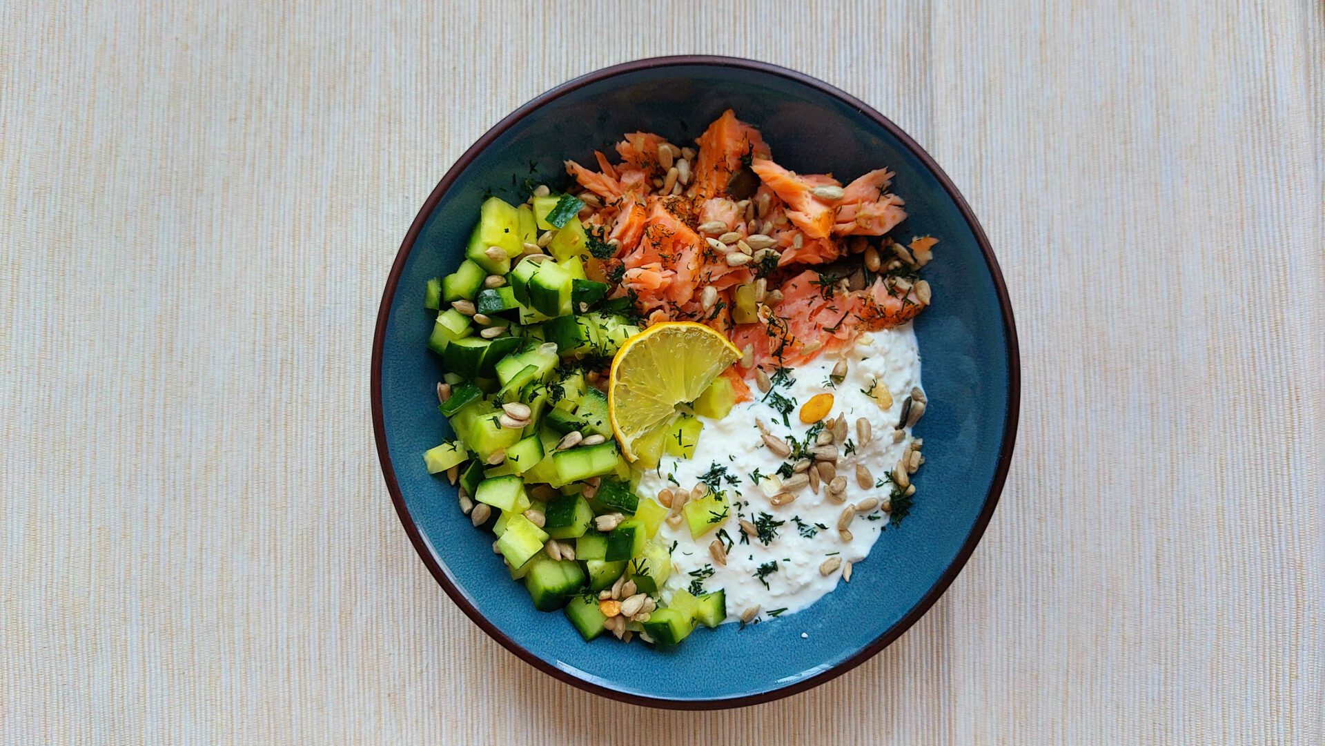 Sałatek jak np. sałatka z łososiem i szpinakiem, sałatka z kurczakiem i dressingiem z awokado.